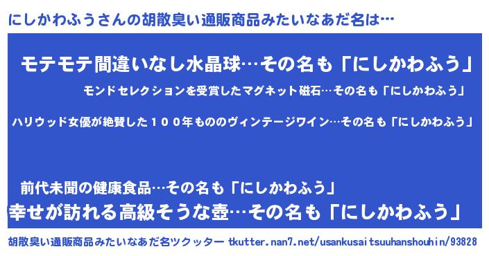 | 意味不明あだ名 | 『住所不定無職にしかわふう(2歳)』 |