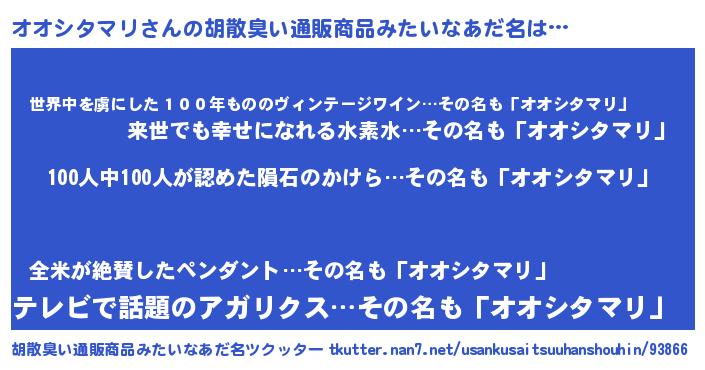 | 男性向けラノベタイトル風あだ名 | 『おまえをオタクにしてやるから、俺をオオシタマリにしてくれ! 』 |