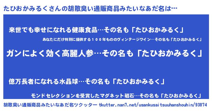 | 女子向けラノベタイトル風あだ名 | 『たひおかみるくなんてお断りですっ。』 |