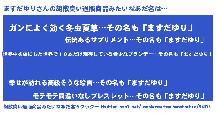 | 意味不明あだ名 | 『住所不定無職ますだゆり(98歳)』 |