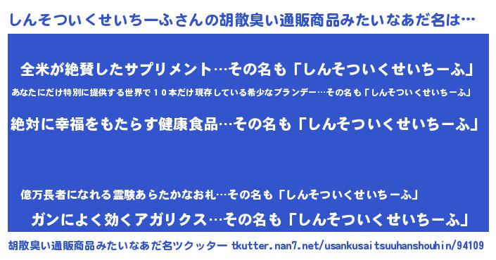 | 男性向けラノベタイトル風あだ名 | 『しんそついくせいちーふという概念が存在しない退屈な世界 』 |