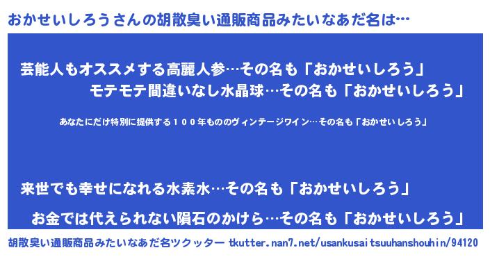 | 意味不明あだ名 | 『住所不定無職おかせいしろう(7歳)』 |