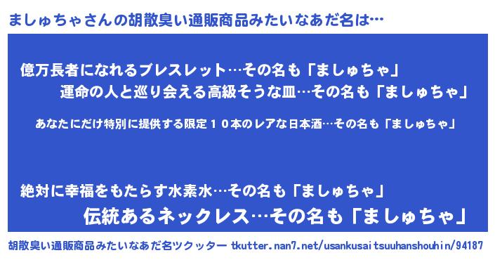 | 男性向けラノベタイトル風あだ名 | 『この素晴らしい世界にましゅちゃを!』 |