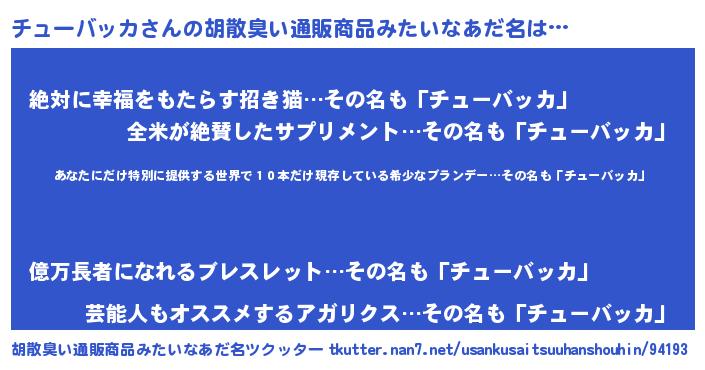 | 意味不明あだ名 | 『住所不定無職チューバッカ(84歳)』 |