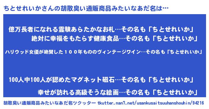 | 意味不明あだ名 | 『住所不定無職ちとせれいか(13歳)』 |