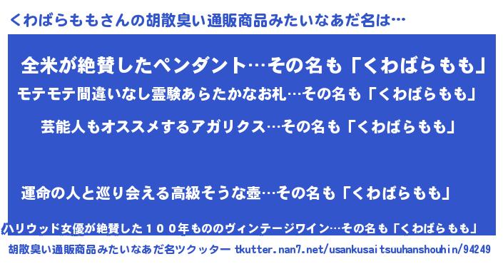 | 意味不明あだ名 | 『自称くわばらもも』 |