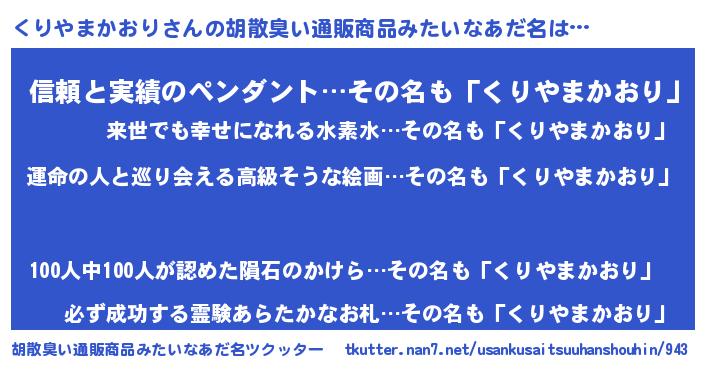 | 男性向けラノベタイトル風あだ名 | 『くりやまかおり~年齢イコール彼女いない歴の魔法使い~』 |