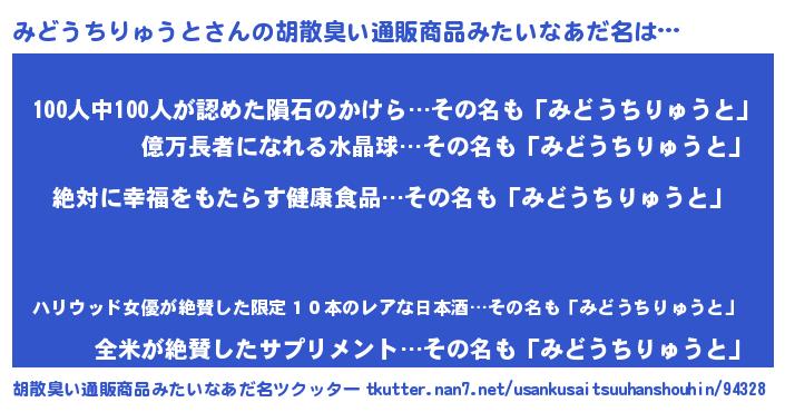 | 男性向けラノベタイトル風あだ名 | 『みどうちりゅうとという概念が存在しない退屈な世界 』 |
