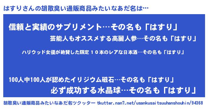 | 男性向けラノベタイトル風あだ名 | 『魔弾の王とはすり』『はすりの憂鬱』 |