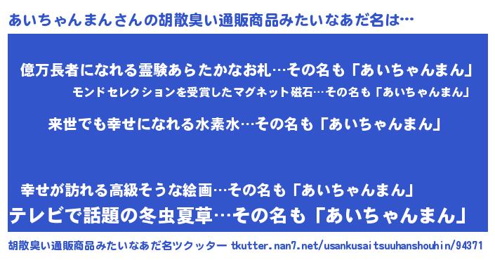| ヘコむあだ名 | 『あいちゃんまん(震え声)』『あいもー』 |