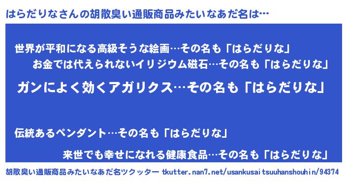| 意味不明あだ名 | 『自称はらだりな』『永久保存はらだりな』 |