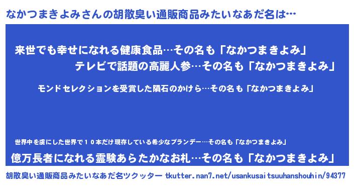 | 男性向けラノベタイトル風あだ名 | 『なかつまきよみ~年齢イコール彼女いない歴の魔法使い~』 |