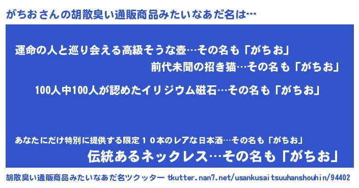 | 欧米人風あだ名 | 『ダニエルがちお』『アンジェラ・がちお』 |