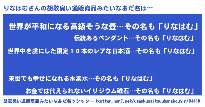 | 男性向けラノベタイトル風あだ名 | 『この素晴らしい世界にりなはむを!』 |