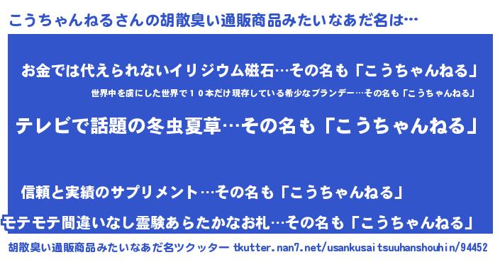 | 男性向けラノベタイトル風あだ名 | 『こうちゃんねるに滅ぼされるだけの簡単なお仕事です』 |