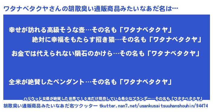 | 男性向けラノベタイトル風あだ名 | 『ワタナベタクヤに滅ぼされるだけの簡単なお仕事です』 |
