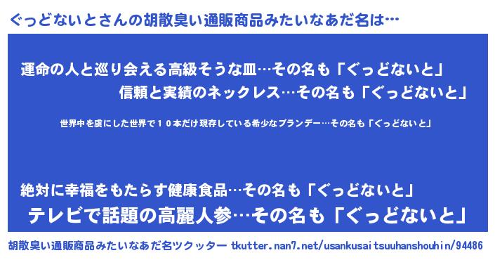 | 意味不明あだ名 | 『住所不定無職ぐっどないと(86歳)』 |