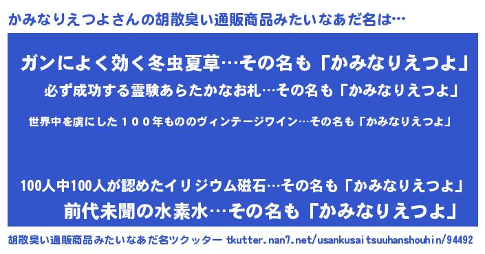 | 意味不明あだ名 | 『住所不定無職かみなりえつよ(13歳)』 |