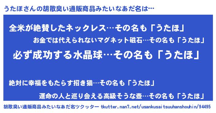 | ヘコむあだ名 | 『うたにゅー』『うたっぺ』『つくし』 |