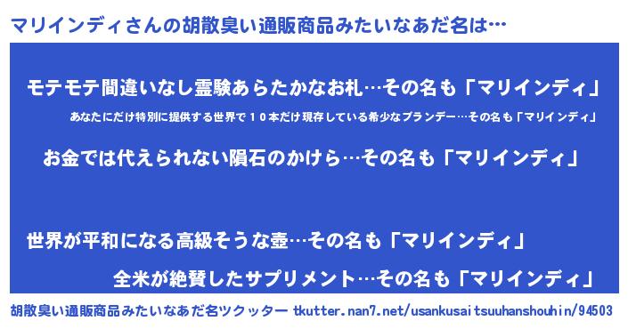 | 男性向けラノベタイトル風あだ名 | 『おまえをオタクにしてやるから、俺をマリインディにしてくれ! 』 |