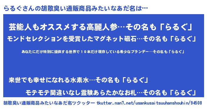 | 意味不明あだ名 | 『住所不定無職らるぐ(93歳)』『自称らるぐ』 |