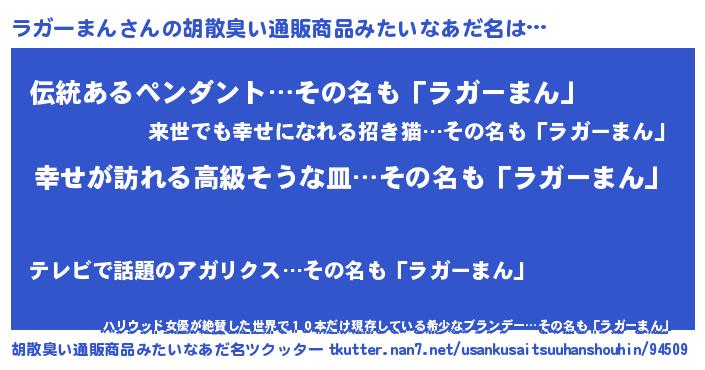 | 男性向けラノベタイトル風あだ名 | 『はたらくラガーまんさま!』 |