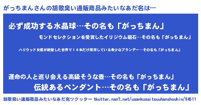 | 意味不明あだ名 | 『住所不定無職がっちまん(71歳)』 |
