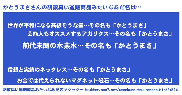 | 意味不明あだ名 | 『永久保存かとうまさ』『自称かとうまさ』 |