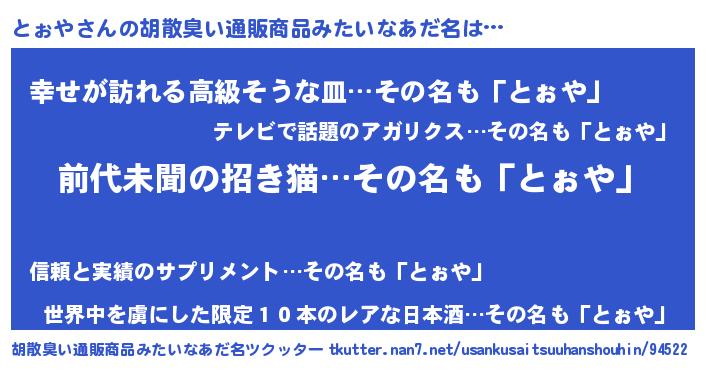 | ヘコむあだ名 | 『とぉや(笑)』『なまこ酢』 |