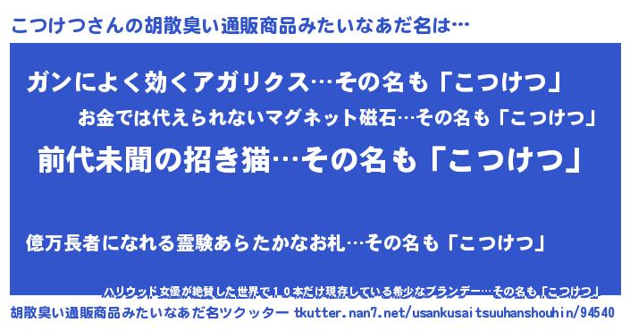 | 意味不明あだ名 | 『永久保存こつけつ』『自称こつけつ』 |