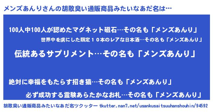 | ヒーロー風カッコイイあだ名 | 『魔戒騎士メン』『愛の使者メンズあんり』 |