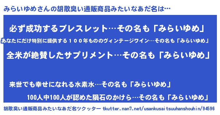 | 男性向けラノベタイトル風あだ名 | 『みらいゆめの嫁は女の子じゃないと思った?』 |