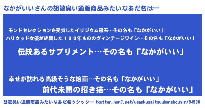 | ヒーロー風カッコイイあだ名 | 『銀牙騎士ナカ』『天空の使者なかがいい』 |