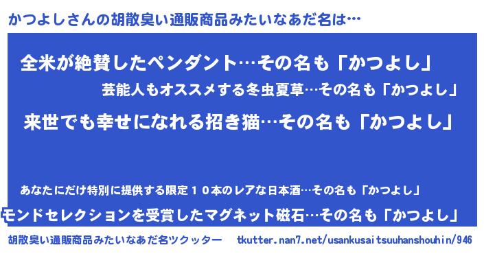 | ヘコむあだ名 | 『かつよし(笑)』『かつぷりん』 |
