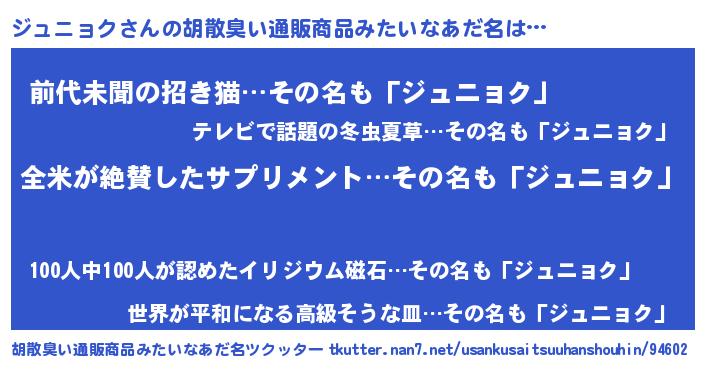 | 男性向けラノベタイトル風あだ名 | 『ジュニョクの嫁は女の子じゃないと思った?』 |