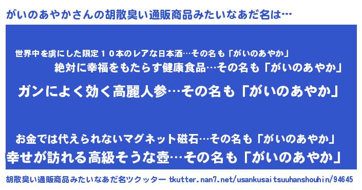 | 意味不明あだ名 | 『自称がいのあやか』 |