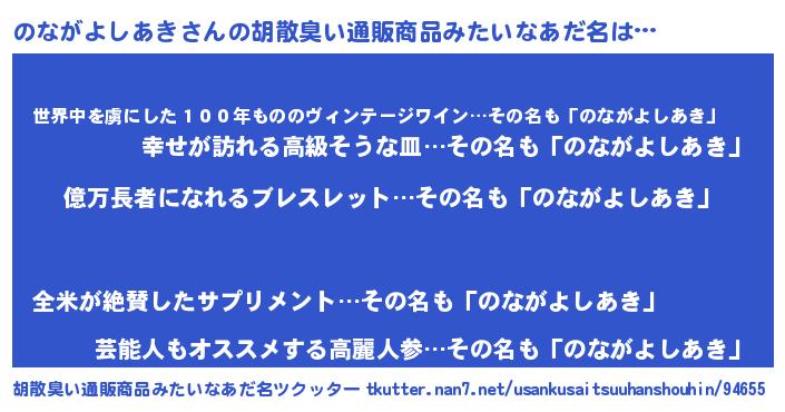 | 男性向けラノベタイトル風あだ名 | 『うちののながよしあきが世界を掌握している!』 |