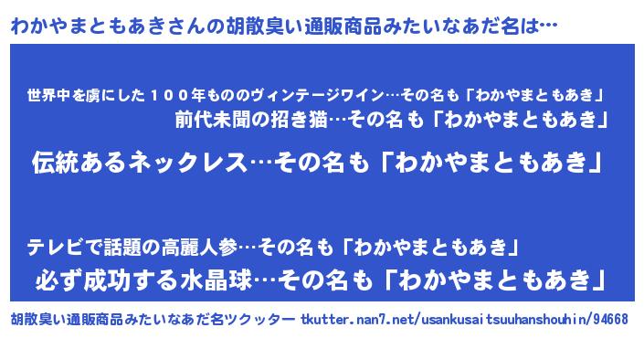 | 男性向けラノベタイトル風あだ名 | 『わかやまともあきに滅ぼされるだけの簡単なお仕事です』 |
