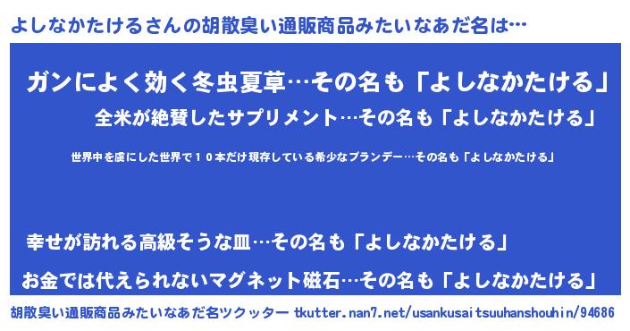 | 意味不明あだ名 | 『住所不定無職よしなかたける(95歳)』 |