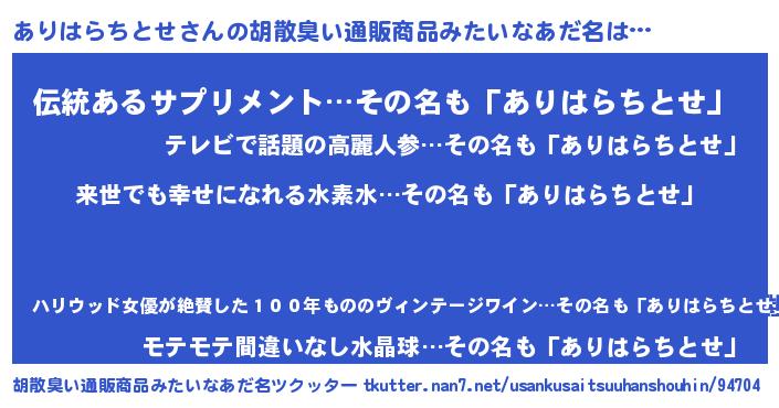 | ヘコむあだ名 | 『ありはらちとせ(遠い目)』『ありを』 |