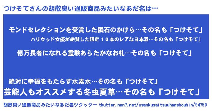 | 意味不明あだ名 | 『ペロリンつけそて』『自称つけそて』 |
