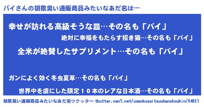 | 意味不明あだ名 | 『とにかく怪しいバイ』『永久保存バイ』 |