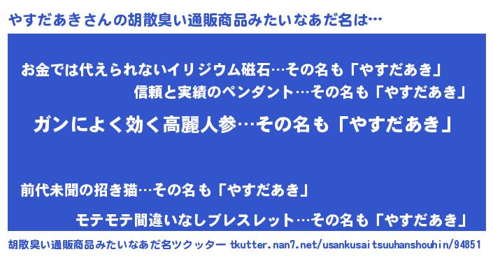肩書あだ名 | 『やすだあき閣下』『やすだあき助手』 |