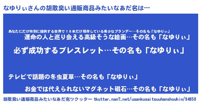| 男性向けラノベタイトル風あだ名 | 『なゆりぃの憂鬱』 |