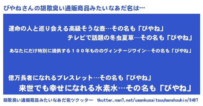 | 意味不明あだ名 | 『住所不定無職びやね(13歳)』『自称びやね』 |