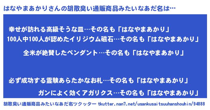| 男性向けラノベタイトル風あだ名 | 『はなやまあかりの嫁は女の子じゃないと思った?』 |