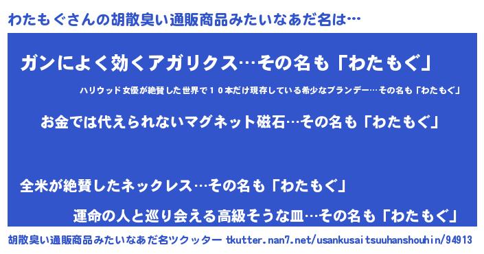 | 男性向けラノベタイトル風あだ名 | 『おまえをオタクにしてやるから、俺をわたもぐにしてくれ! 』 |
