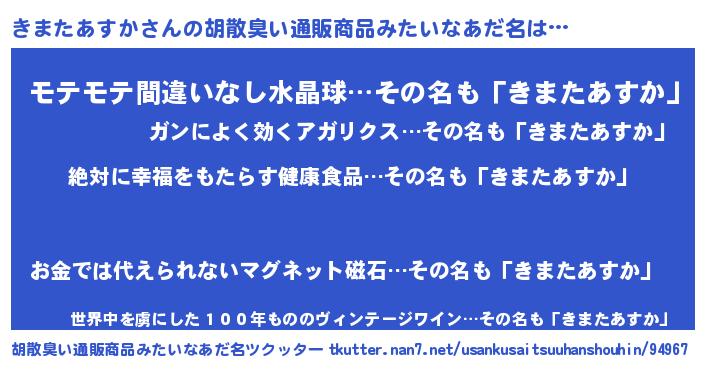 | ヘコむあだ名 | 『きまたあすか(爆)』『きまにゅー』 |