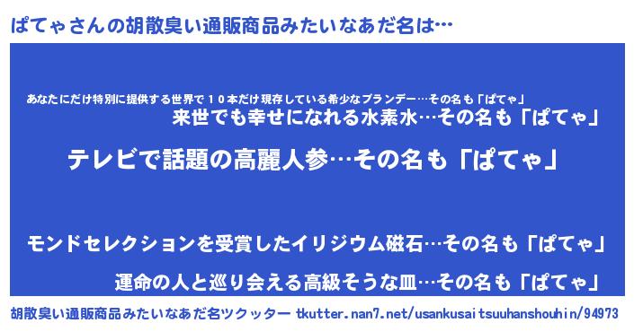 | 意味不明あだ名 | 『自称ぱてゃ』『住所不定無職ぱてゃ(62歳)』 |