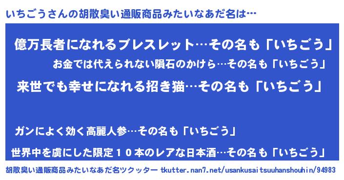 | 男性向けラノベタイトル風あだ名 | 『転生したらいちごうだった件』 |